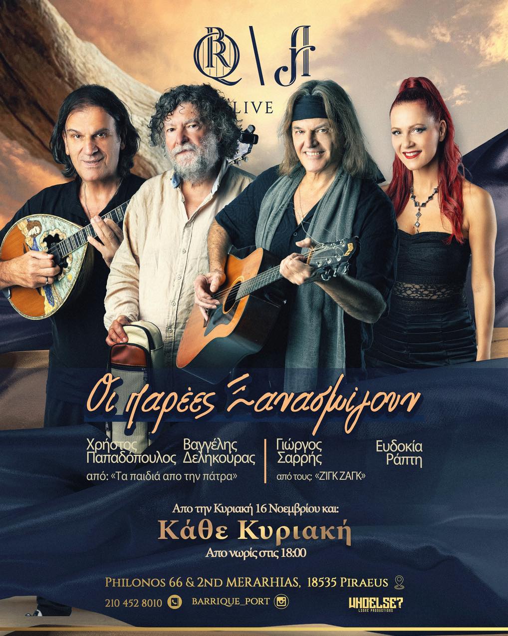 BARRIQUE PORT - טברנה שמתמחה במאכלי בשר וסטייקים. ממוקמת בנמל פיראוס עם למעלה מ 200 סוגי יינות ומנות יחודיות. מארחת בכל יום ראשון בצהריים החל מהשעה 18:00 את הזמרת אבדוקיה רפטי יחד עם כריסטוס פאפאדופולוס, יורגו סאריס וונגליס דליקוראס. הכתובת: Filonos 66 טלפון להזמנות: 2104528010 לדף הפייסבוק.