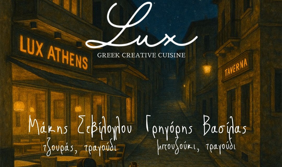 LUX ATHENS - טברנה יפיפייה עם אוכל מוקפד וטעים.(מדובר בתפריט שונה ומתוחכם יותר ממה שמוצע בדרך כלל בטברנות) בעונת החורף 25/25 בכל שישי ושבת עם גריגוריס ווסילאס ומאקיס סווילוגלו ושאר חברי הלהקה. רחוב Psaron 26 טלפון 2105240888 כ 5 דקות הליכה מתחנת המטרו Metaxourgeio. פרטים נוספים ועדכונים בדף הפייסבוק של הטברנה. (דמי כניסה של 10 יורו עבור הנגנים)